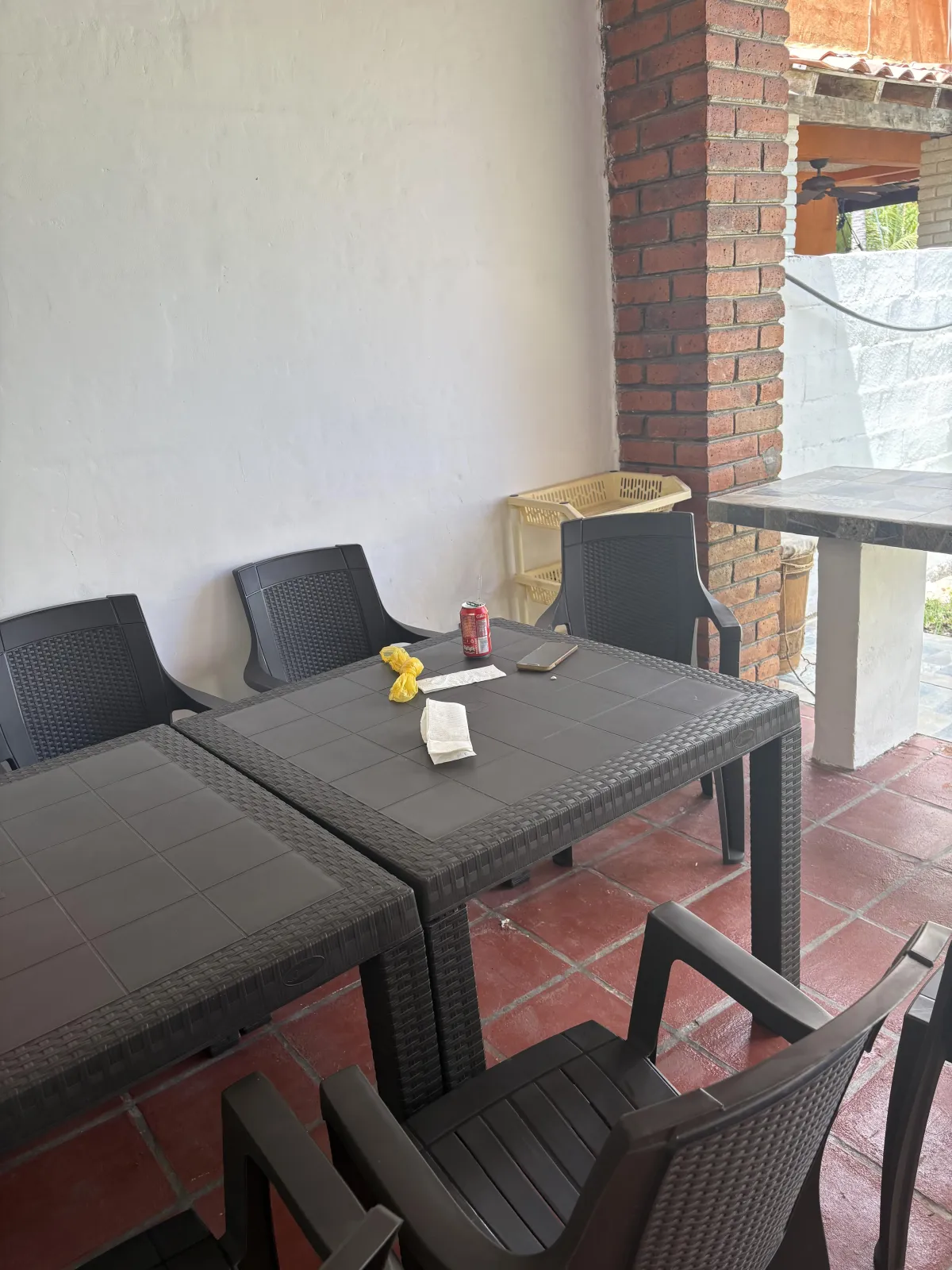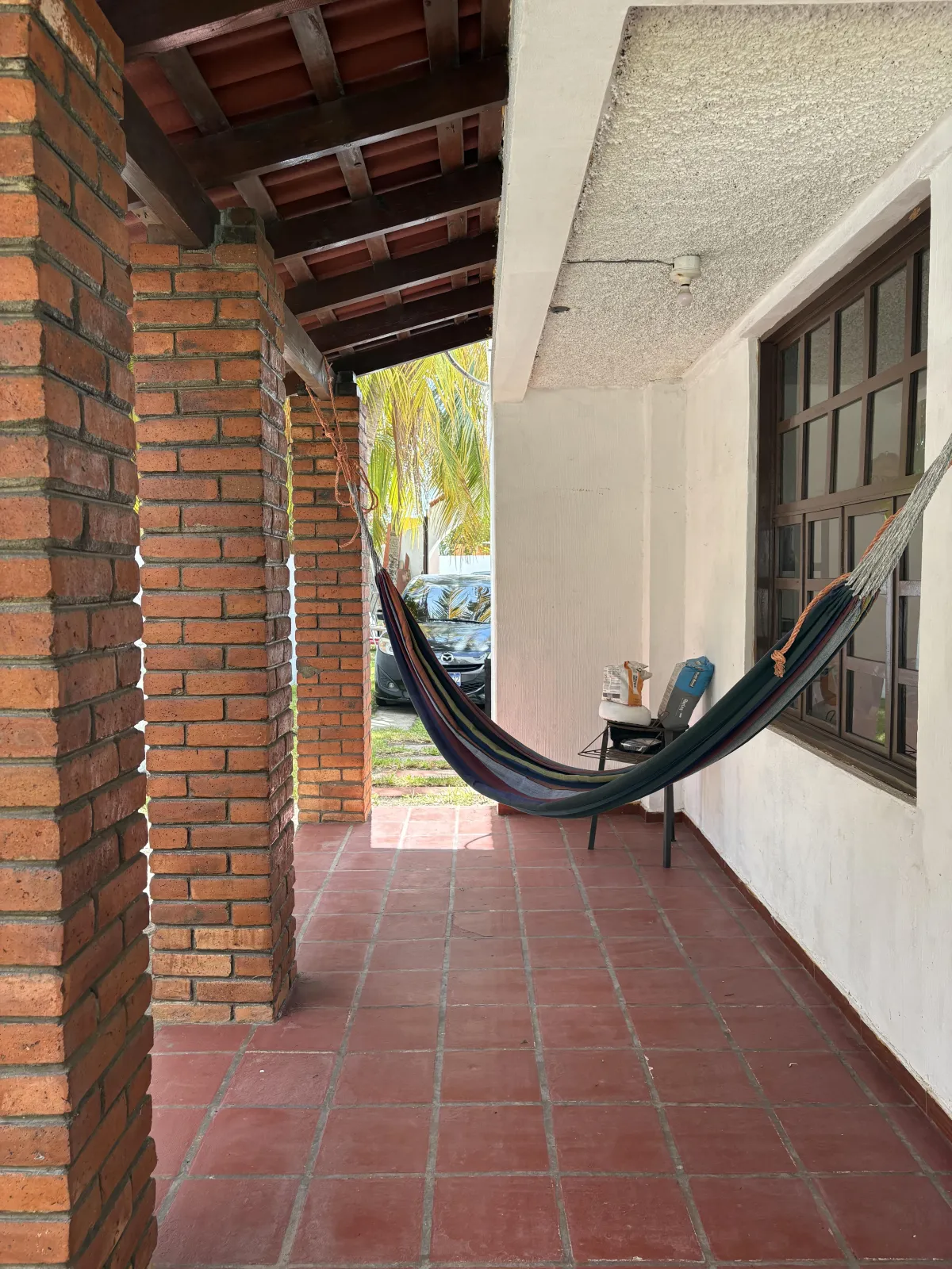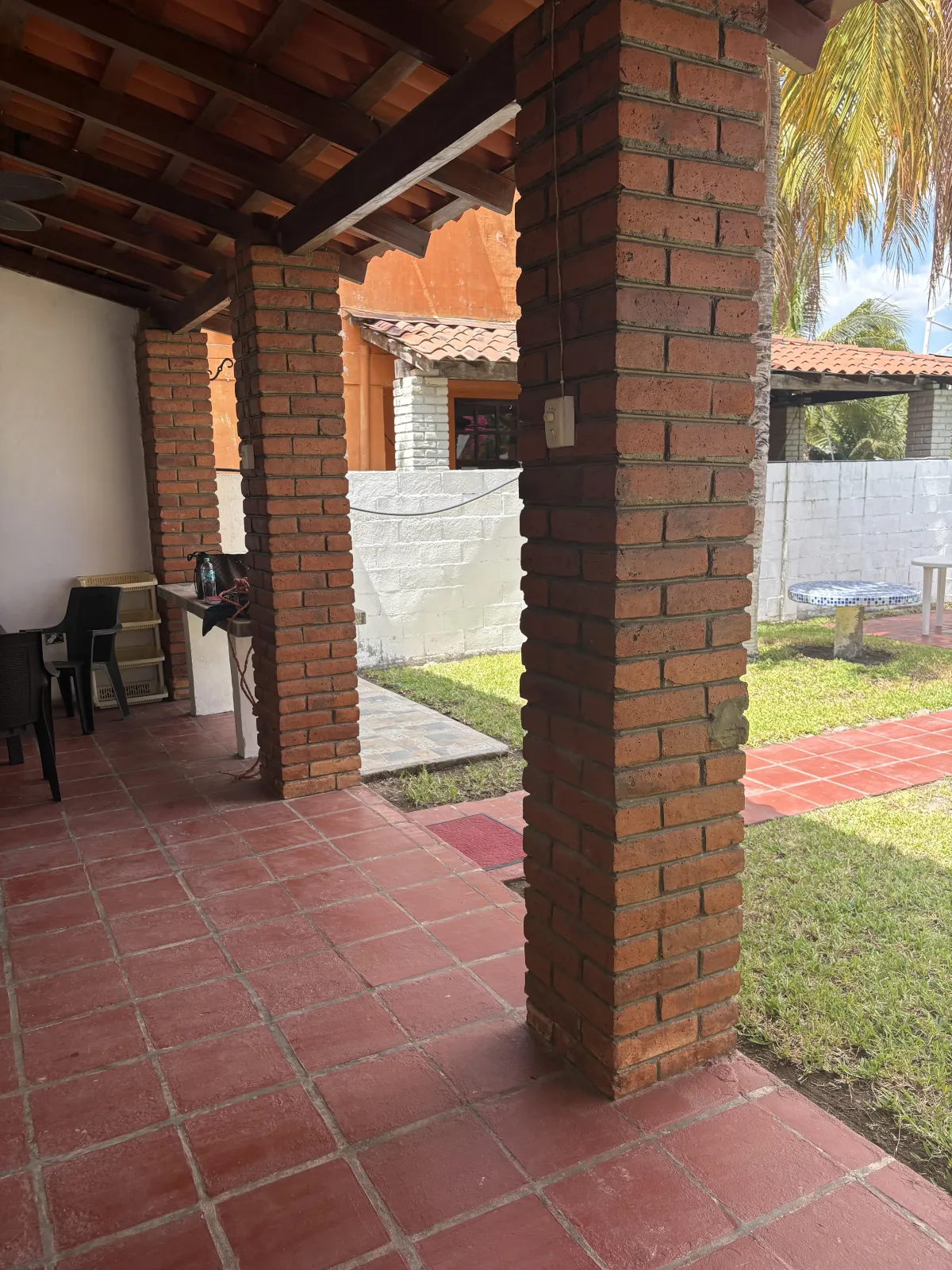 Amplia terraza techada al aire libre, ideal para relajarse y compartir en grupo. Cuenta con hamacas, mesas y cocina, perfecta para descansar durante el día, disfrutar la brisa marina o convivir por las noches.