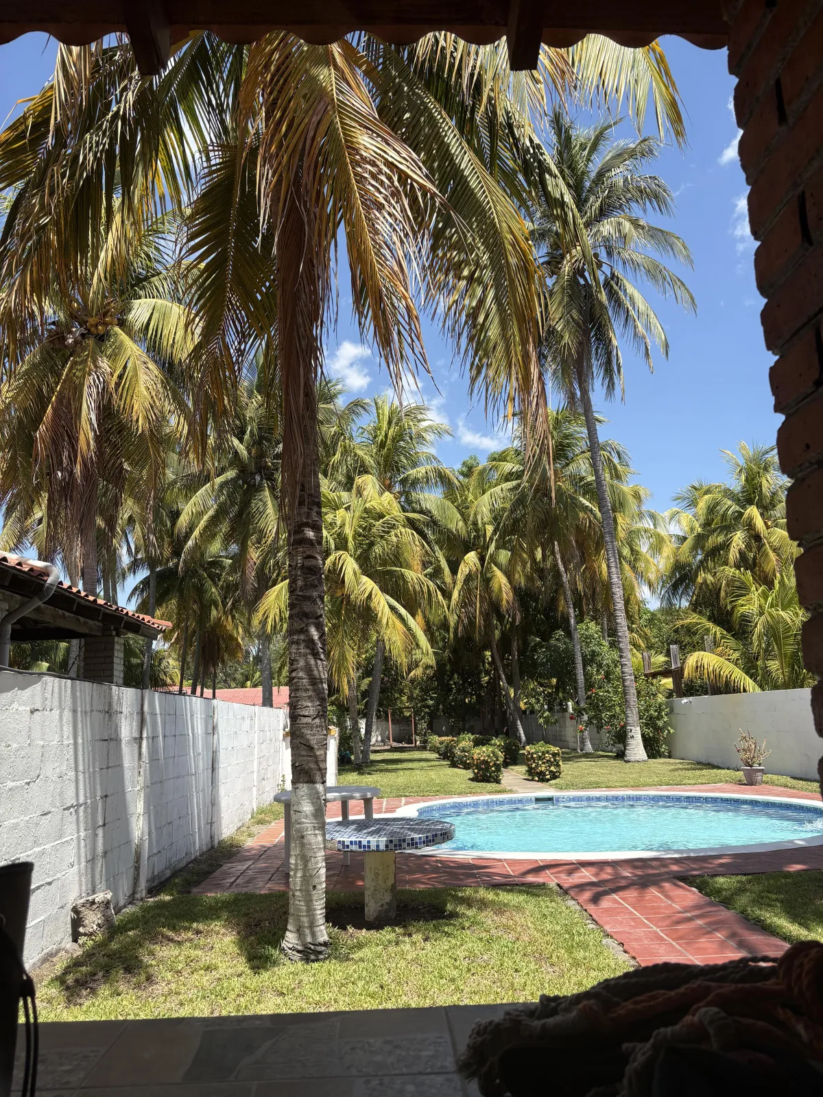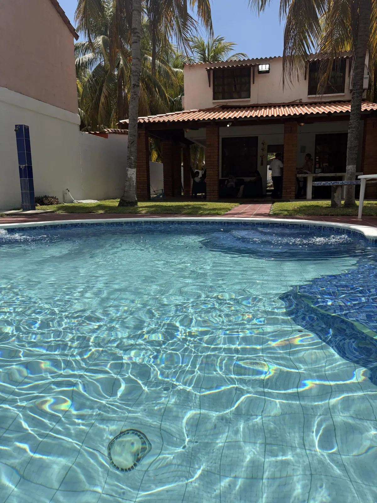 Hermosa piscina privada rodeada de áreas verdes y palmeras, perfecta para relajarse, disfrutar del clima tropical y pasar tiempo de calidad en un entorno tranquilo y exclusivo